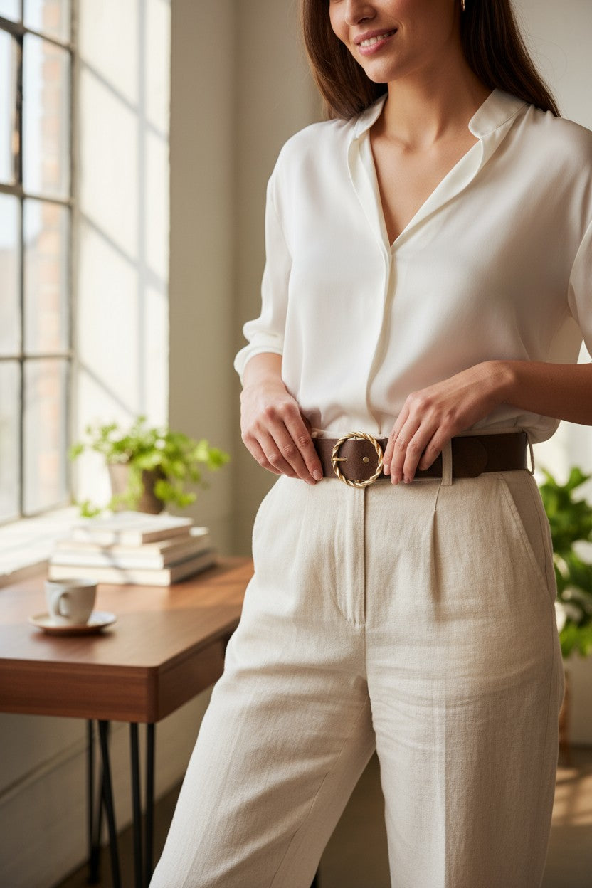 Eskitme efektli yüzeyi ve burgulu yuvarlak toka tasarımıyla vintage ruhunu modern detaylarla birleştiren bu kemer, koyu kahverengi tonu ile doğal ve güçlü bir stil sunar. Geniş formu sayesinde elbiselerden oversize gömleklere kadar pek çok parçayla kolayca kombinlenebilir. Gümüş ve altın renkli metal toka seçenekleriyle tarzınıza en uygun varyasyonu tercih edebilirsiniz.