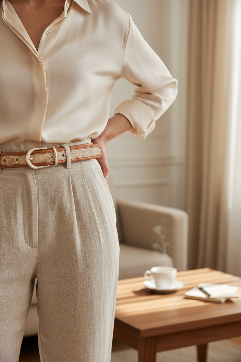 Doğal dokulu şerit detayı ve taba renk çerçevesiyle sezonun öne çıkan parçalarından biri. Altın renk metal tokasıyla zarif bir şıklık sunarken, gündelik ve yazlık kombinlere sıcak bir dokunuş katıyor. Hem rahat hem de şık bir tamamlayıcı arayanlar için ideal bir seçim.