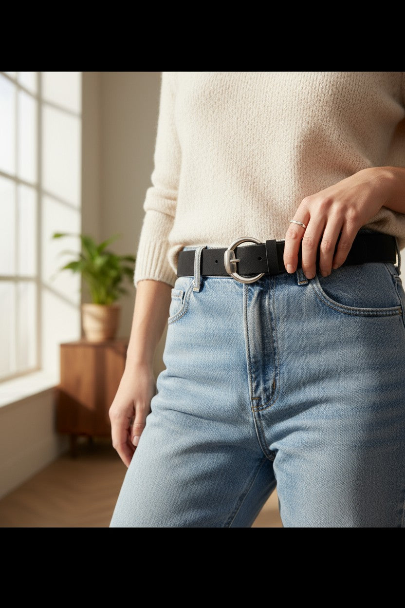 Zamansız siyahın sofistike etkisini, yumuşak süet dokulu yüzeyle buluşturan bu kemer; parlak gümüş renkli D formlu tokasıyla sade ama güçlü bir stil sunar. Günlük kombinlerden klasik parçalara kadar çok yönlü kullanım imkânı sağlar.