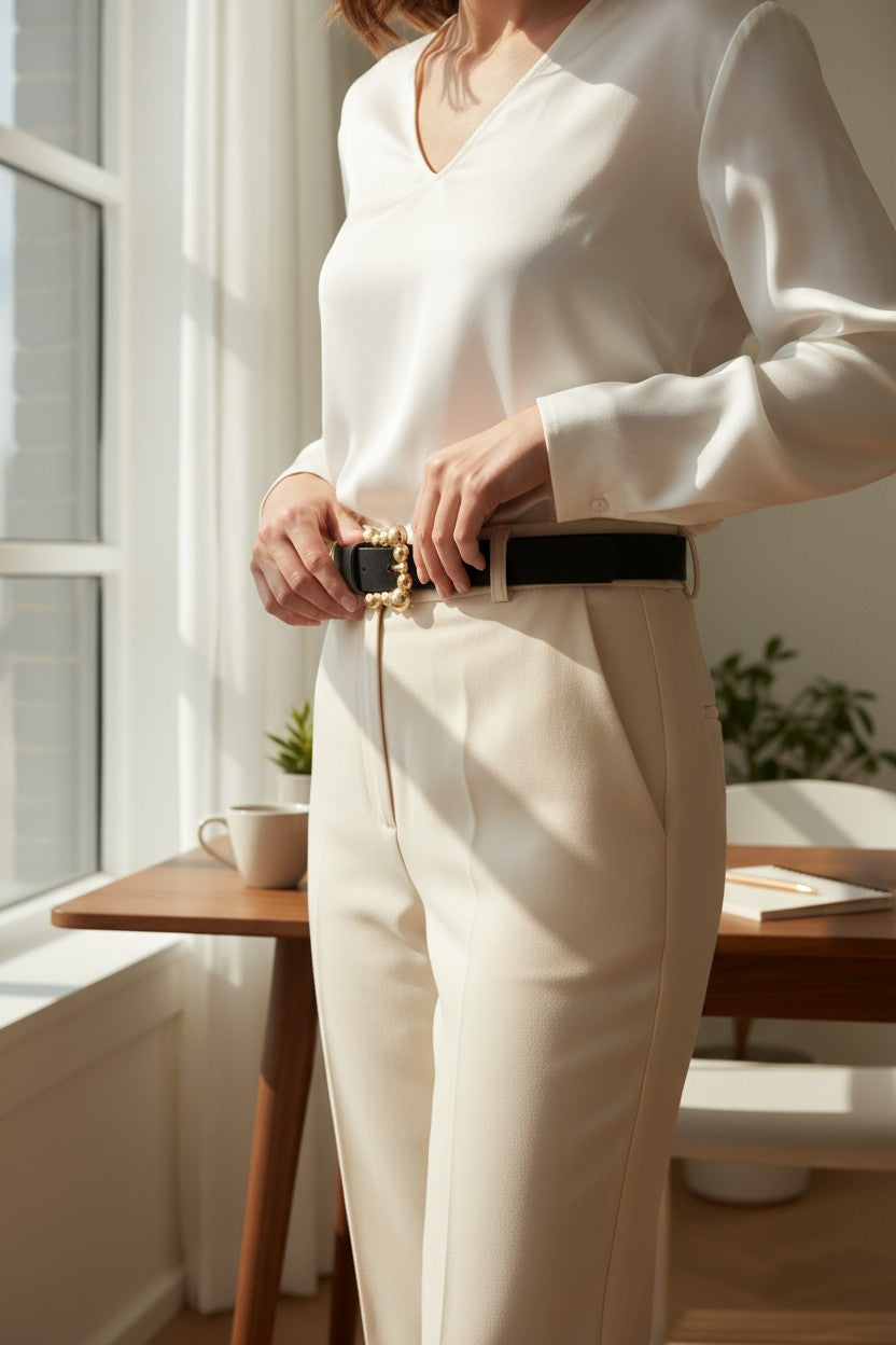 Yumuşak süet dokusuyla zarif bir his sunan bu kemer, boncuk formlu altın metal tokasıyla dikkat çeken iddialı bir aksesuardır. Hem klasik hem modern kombinlerin havasını anında değiştirecek bu özel tasarım, stilinde özgün detaylar arayanlar için ideal.