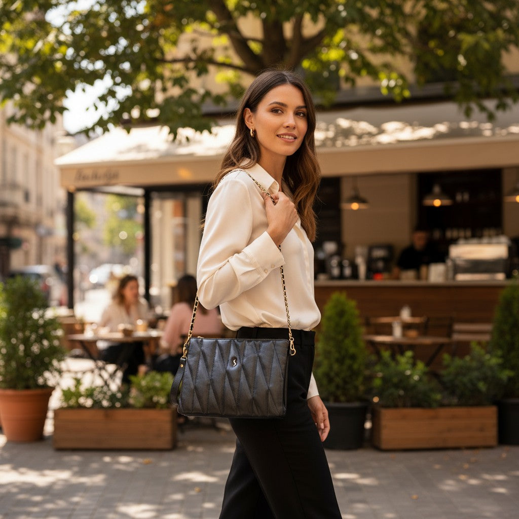 Zarif kapitone dokusu ve altın rengi metal zincir askısıyla Mila, hem gündüz hem gece kombinlerinize şıklık katar. El çantası, omuz çantası ya da clutch olarak kullanılabilen bu çok yönlü tasarım; davetlerden günlük stilinize kadar geniş bir kullanım alanı sunar. Minimal formuna rağmen iç hacmi pratik kullanım sağlar.