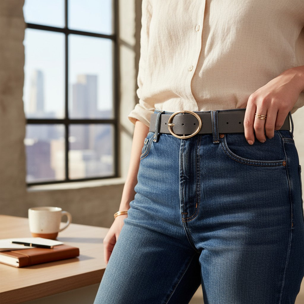 Klasik kahve tonuna modern halka detay ekleyen bu kemer, hem günlük hem şık kombinlerde rahatça kullanılır.